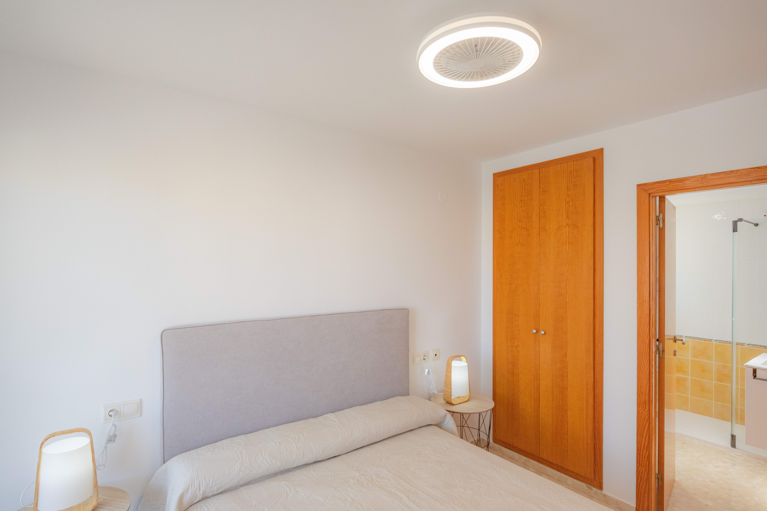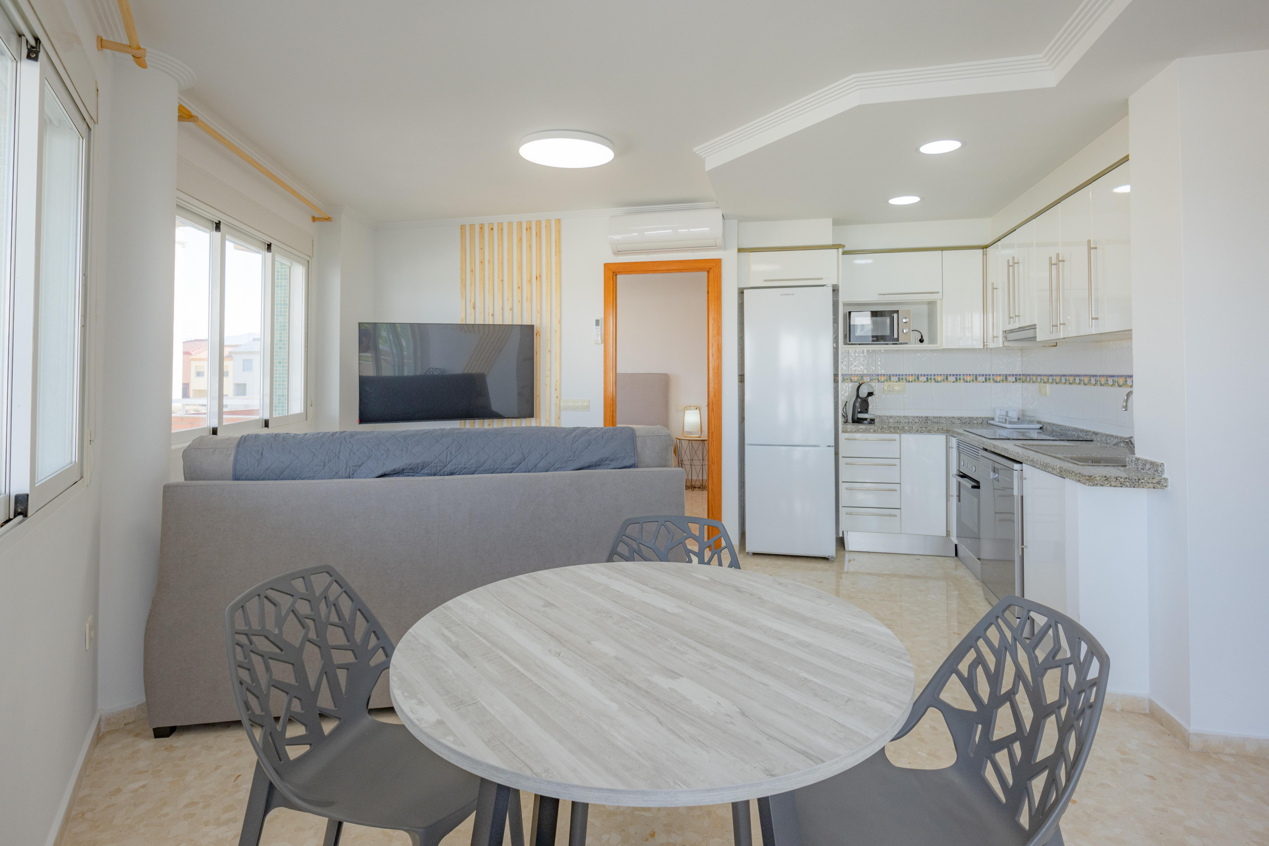 Die Wohnung verfügt über ein gemütliches Hauptschlafzimmer mit einem großen Schrank, ein zweites Schlafzimmer mit zwei Einzelbetten und einem Schrank sowie ein komplettes Badezimmer. Der Wohnbereich und die Küche sind komfortabel gestaltet, und eine beeindruckende 100 m² große Terrasse umgibt die Wohnung und bietet einen perfekten Platz für die Erholung im Freien. Die Klimaanlage im Wohnzimmer sorgt das ganze Jahr über für ein angenehmes Klima.