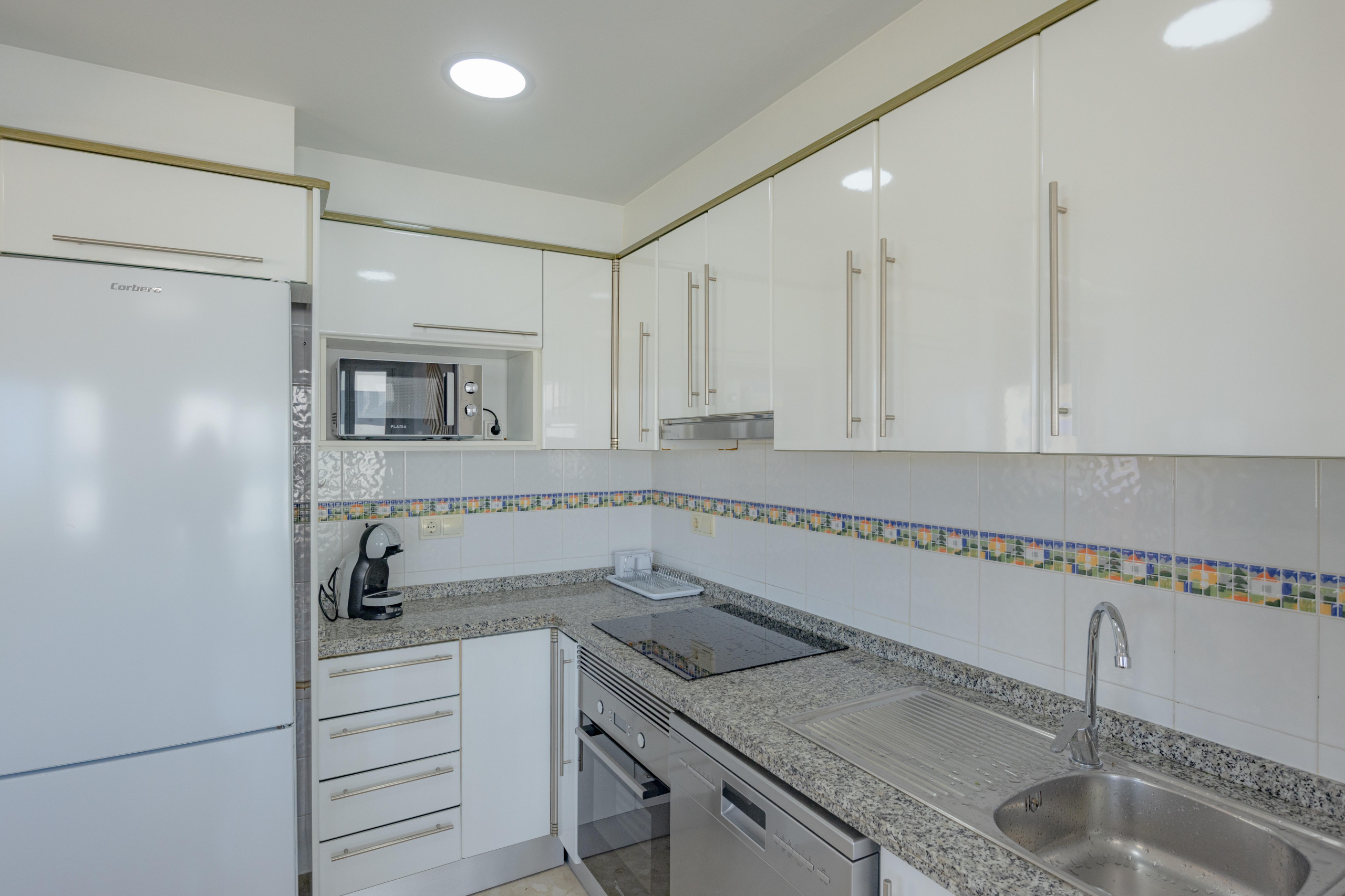Das Apartment verfügt über zwei Schlafzimmer, zwei Badezimmer, eine voll ausgestattete offene Küche und eine geräumige Terrasse mit herrlichem Meerblick. Ausgestattet mit Backofen, Klimaanlage im Wohnzimmer, WLAN, einem Gemeinschaftspool und einer privaten Garage bietet es hohen Komfort und Lebensqualität.